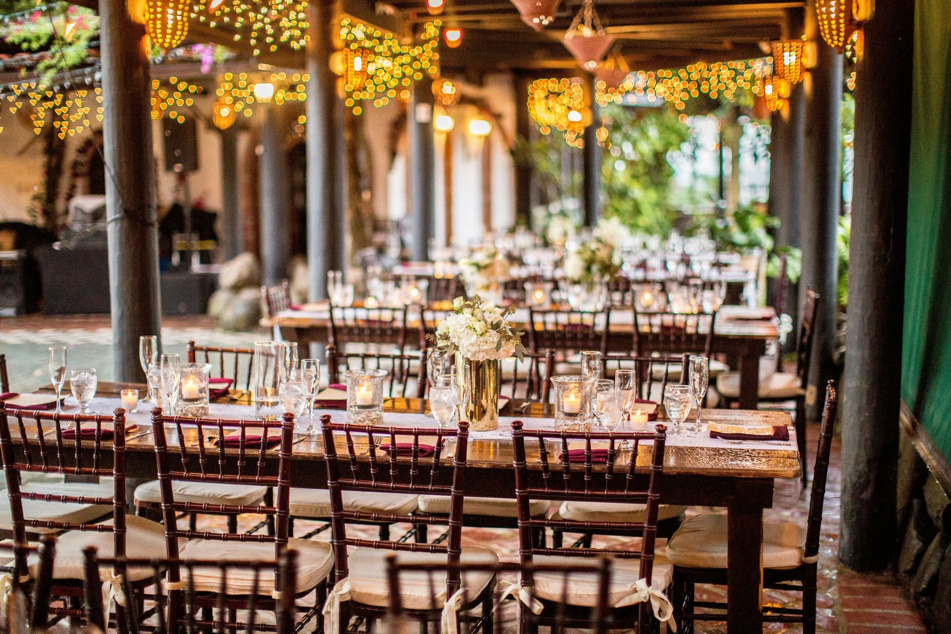 De gasten nemen allemaal plaats aan lange tafels en de gerechten worden op stijlvol opgemaakte borden en schalen aan tafel geserveerd.